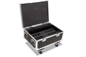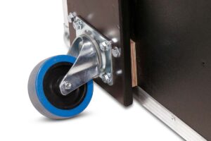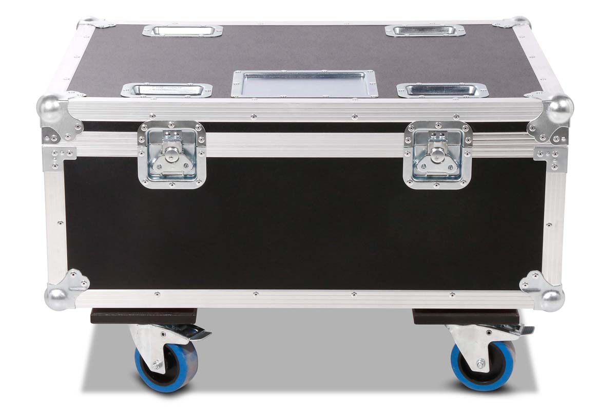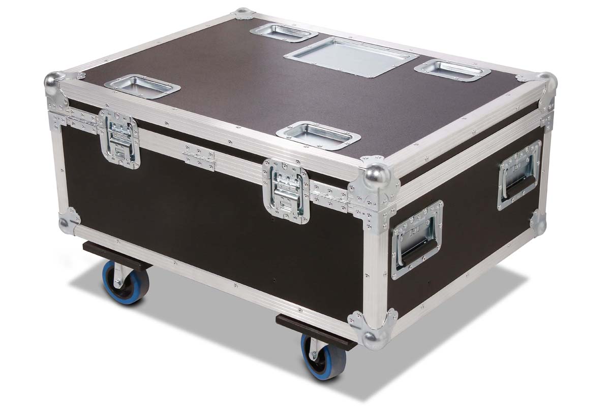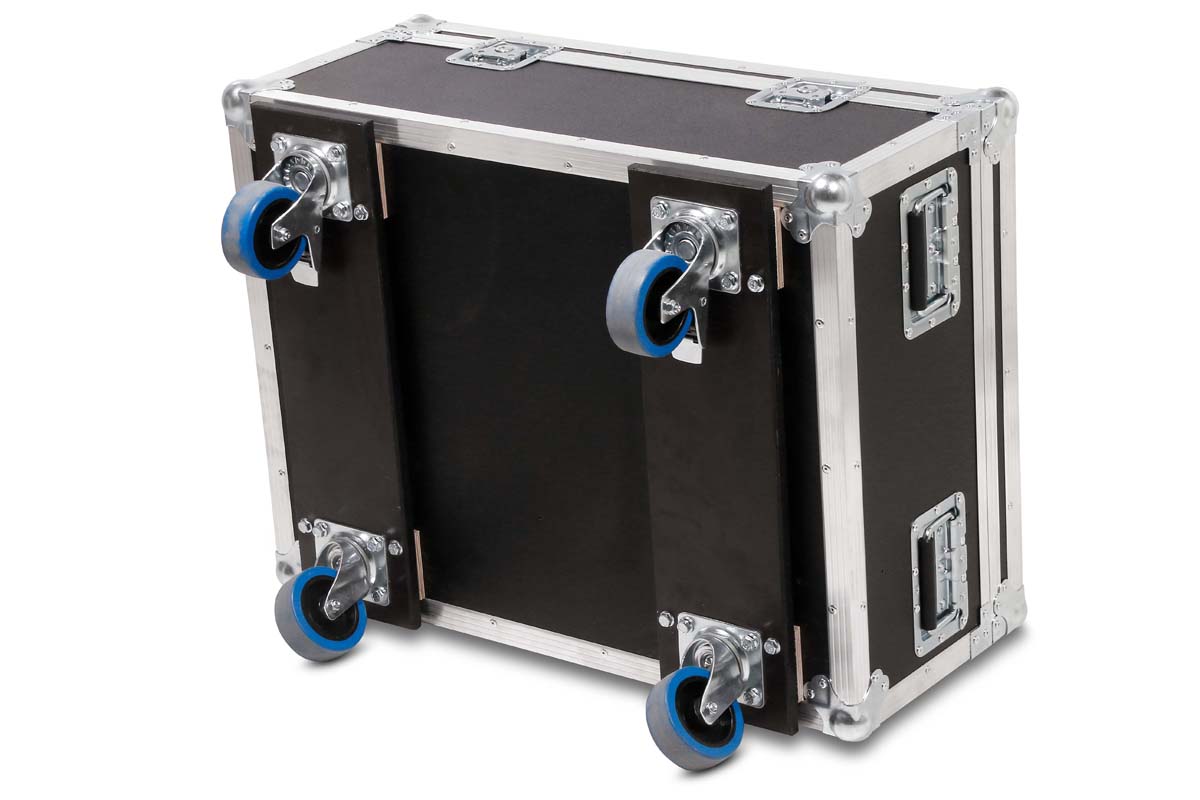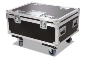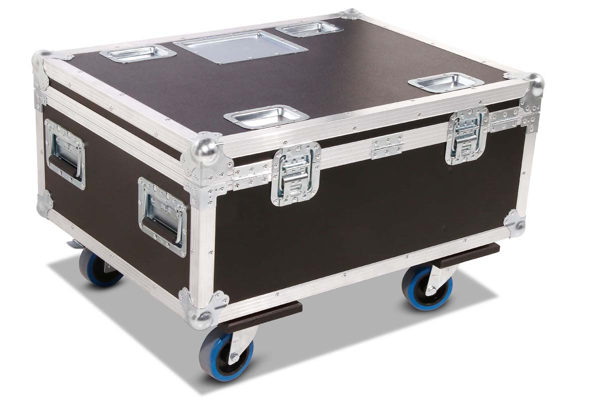 Robust professional chest case made of black polyboard, equipped with four swivel casters, two of which have brakes.