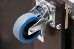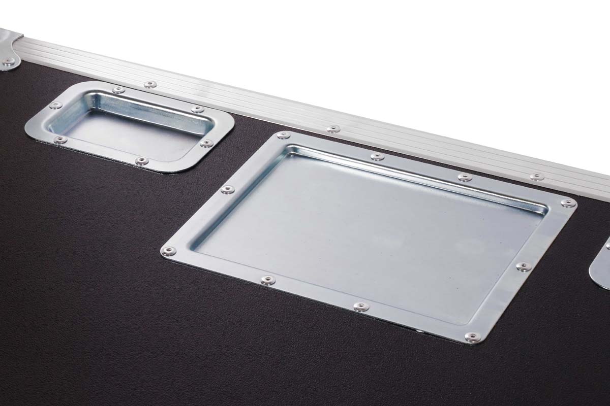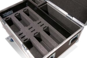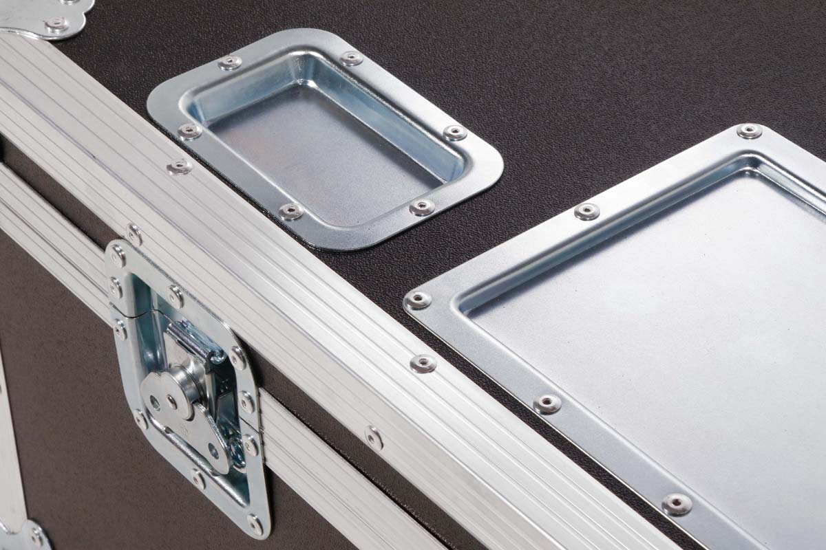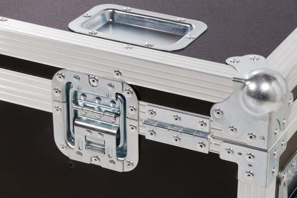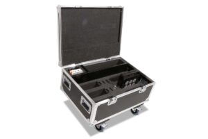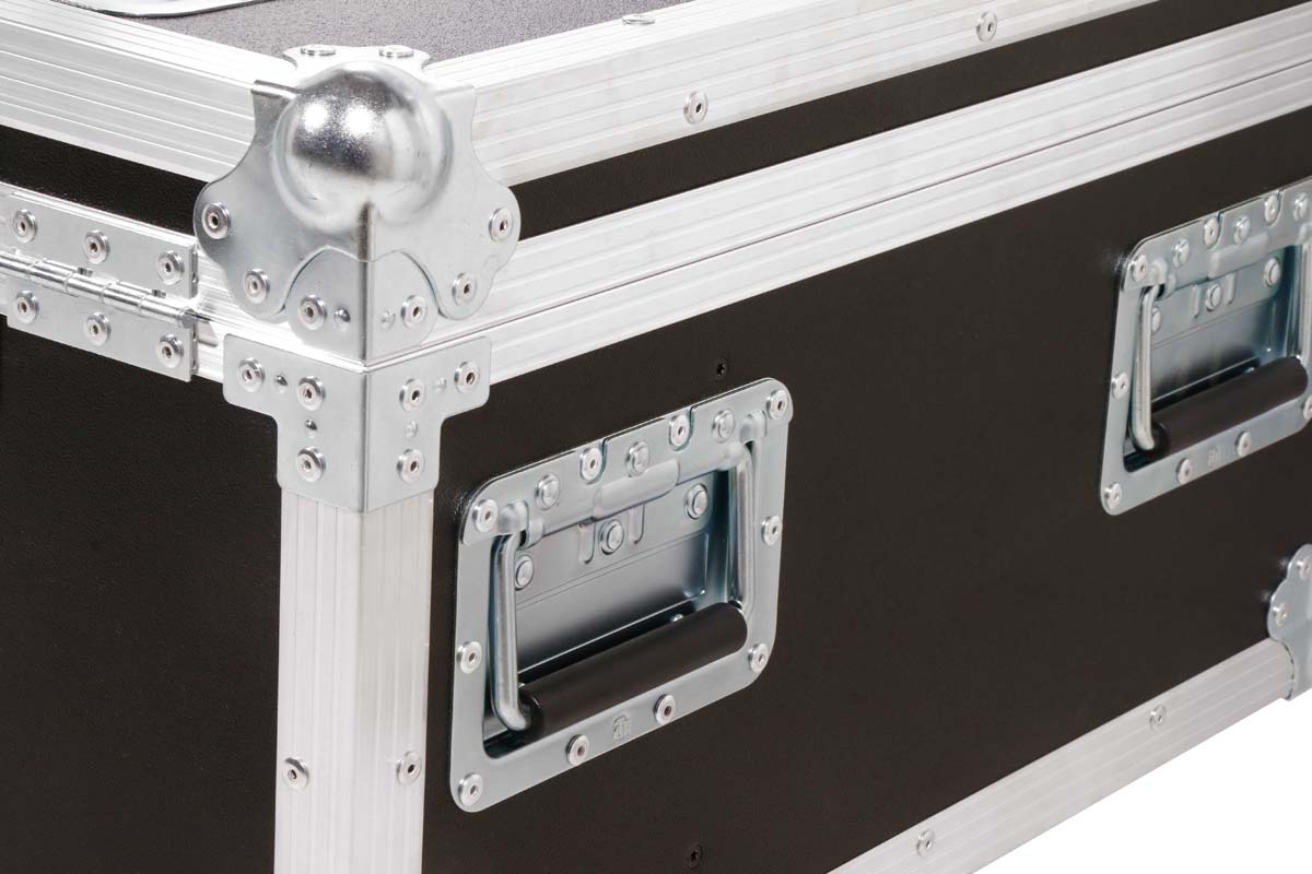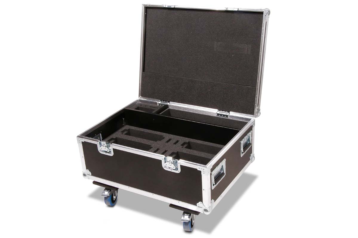Robust professional chest case made of black polyboard, equipped with four swivel casters, two of which have brakes.