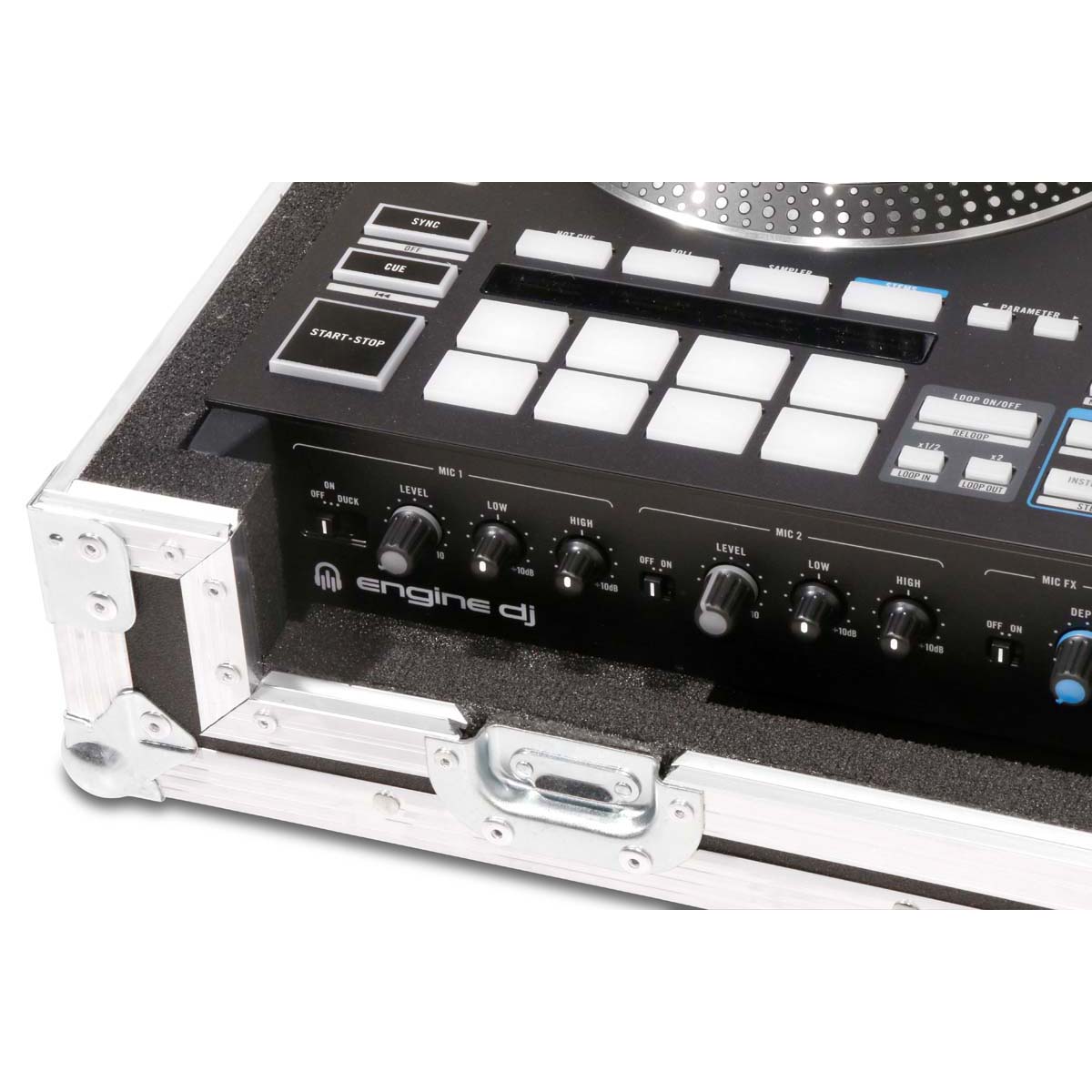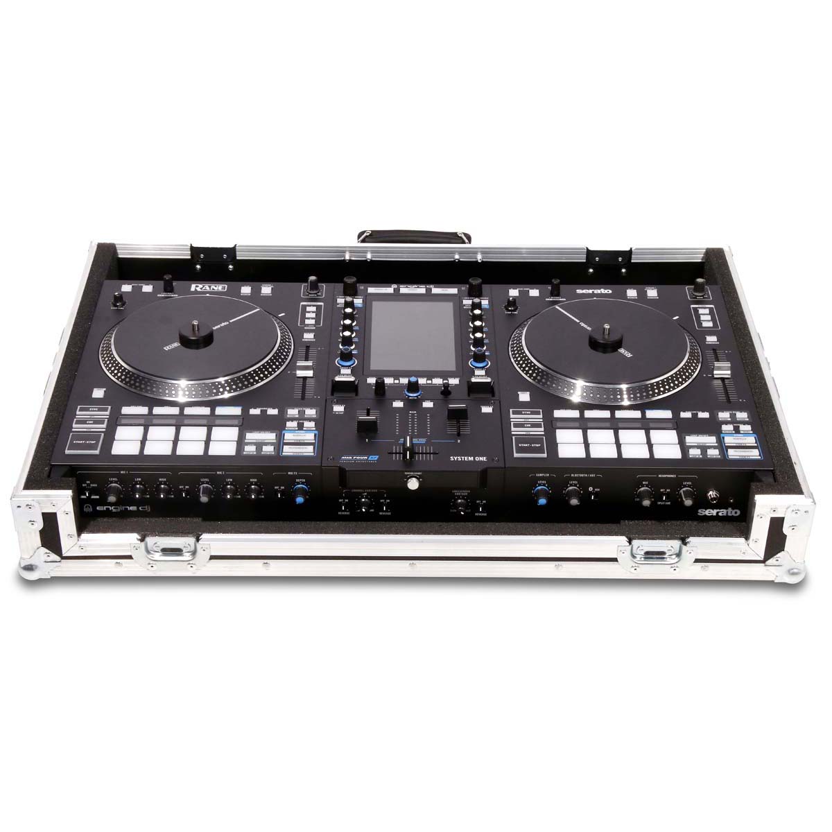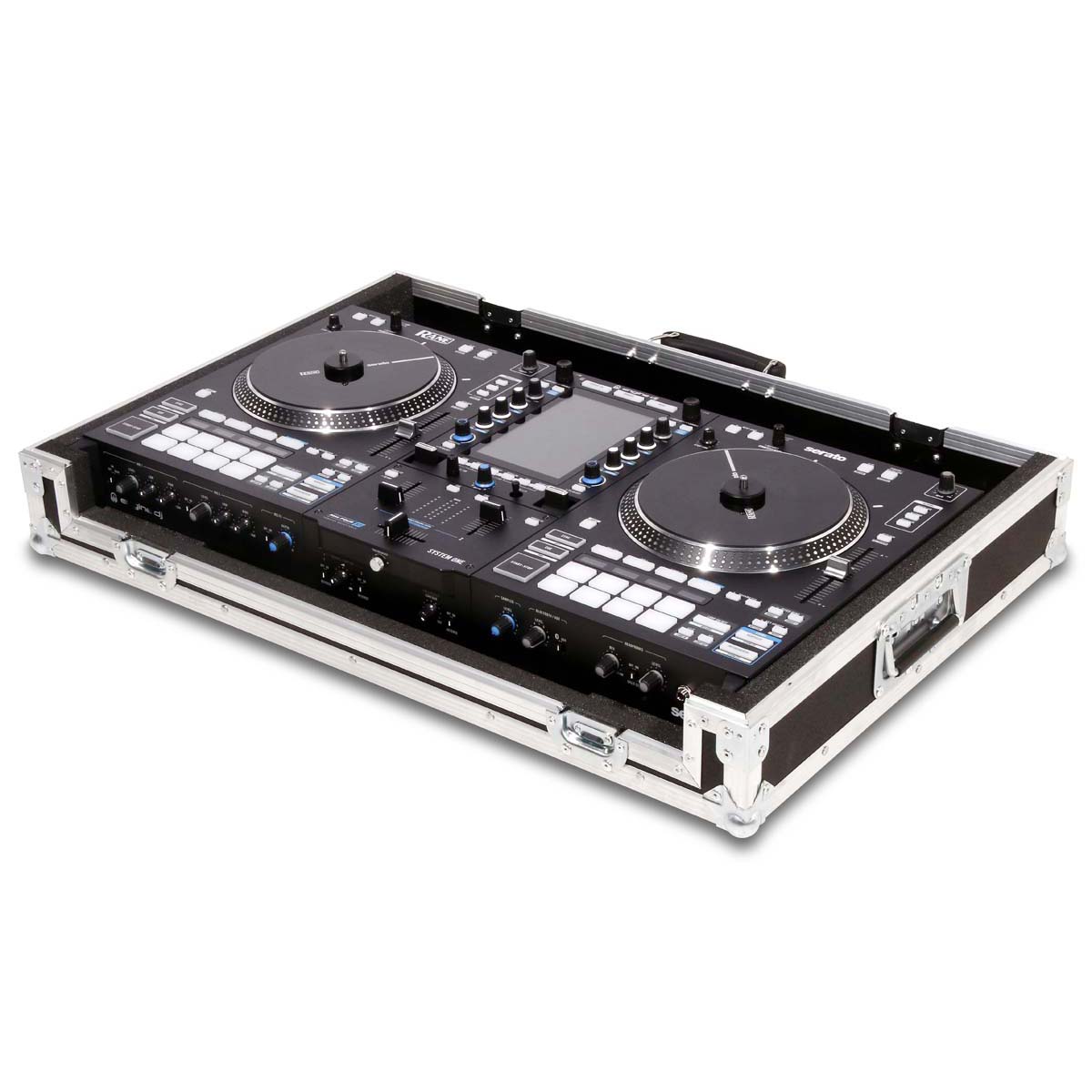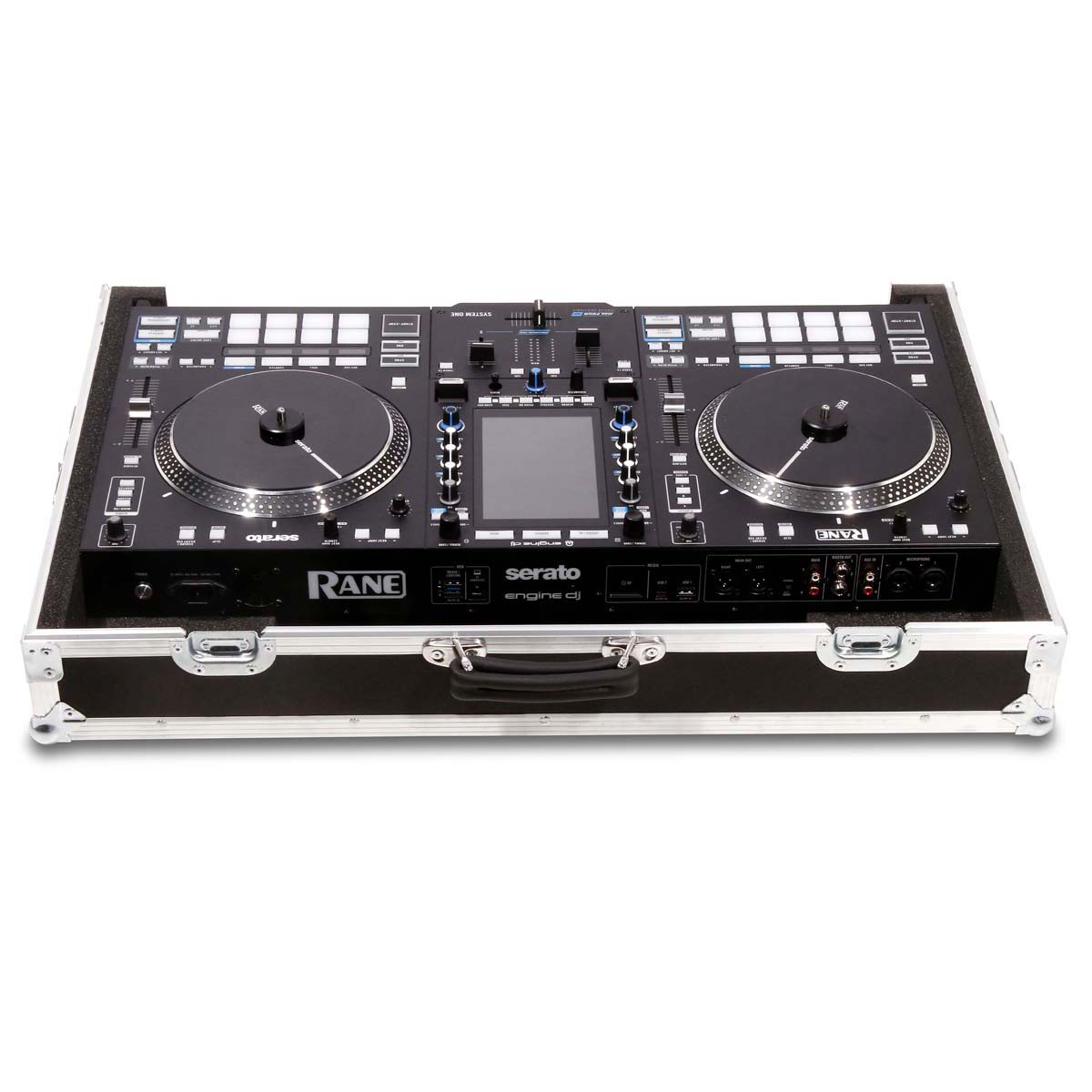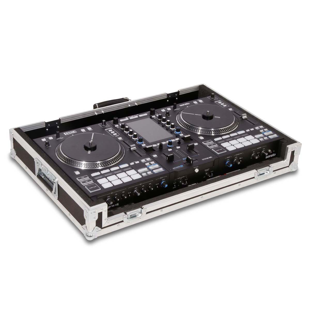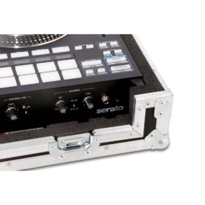 Professionele console voor de Rane System One controller, ontworpen voor veilig transport en handig gebruik in DJ- of eventomgevingen. De controller rust in een op maat gemaakte schuimrubberen voering en kan direct vanaf de onderkant van de koffer worden bediend.